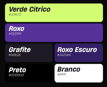 A logo, composta por uma estrela em pixel art, simboliza criatividade, orientação e destaque, funcionando como um elemento central de reconhecimento visual da marca. A escolha das cores, com predominância do roxo e do verde, reforça o caráter tecnológico e inovador, ao mesmo tempo em que cria contraste e personalidade.